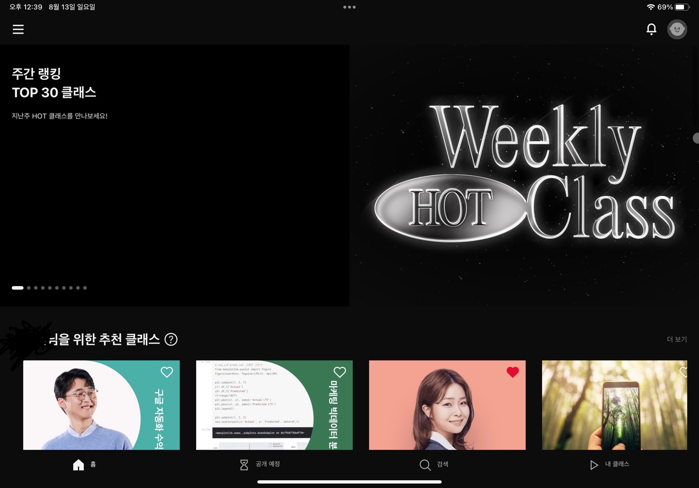 우선 카카오톡을 사용하는 장치에서는 모두 강의 시청이 가능했다. 크롬 브라우저, 아이폰 앱, 아이패드 앱 이 세 가지 기기에서 사용중이다. 대부분 이용하는 교육 플랫폼과 비슷하지만 한 가지 아쉬운점이 있다면 내가 학습하던 강의를 클릭했을 때 이어서 재생되는 것이 아니라 다시 인트로부터 나올때가 있다. 그럴땐 내가 수강했던 부분까지 찾아서 이동해야 했다. 혼자 찾아보던 중에 내 클래스에서 들어가면 이어서 재생이 가능하지만 앱을 처음 키고 내가 듣던 강좌가 노출되어 있을 때 클릭하면 인트로로 나오는 것 같았다. 뭐 내 클래스에서 수강하는 습관을 들여야 하나보다.