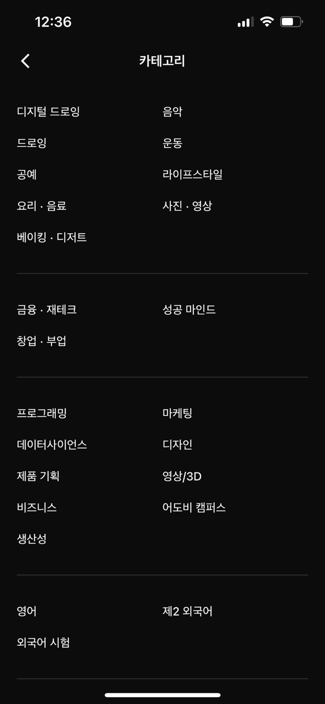 종류가 많지만 컨텐츠의 질을 생각하자면 아직까지는 물음표이다. 많은 후기들을 보면 구독형으로 바뀌고나서 좋은 컨텐츠가 많이빠졌고 질이 안좋아졌다는 후기를 꽤 많이 봤다. 내가 6개월 동안 사용하면서 느낀 점을 말해보자면 “딱 돈 값은 하네”라고 말하겠다. 아직까지 강의를 하는 사람이 주제와 크게 벗어나거나, 주제에 맞지 않은 저품질의 강의를 보지는 못했기 때문이다. 하지만 아쉽게 생각할 수 있는 점은 대부분의 강사들이 클래스101 외부에서 본인들의 채널에서 추가 컨텐츠로 유혹한다는 점이다. 진짜 좋은 마인드로 뭔가를 베풀고 강의하는 사람이라면 한 강좌에서 다 풀어도 되지 않았을까?