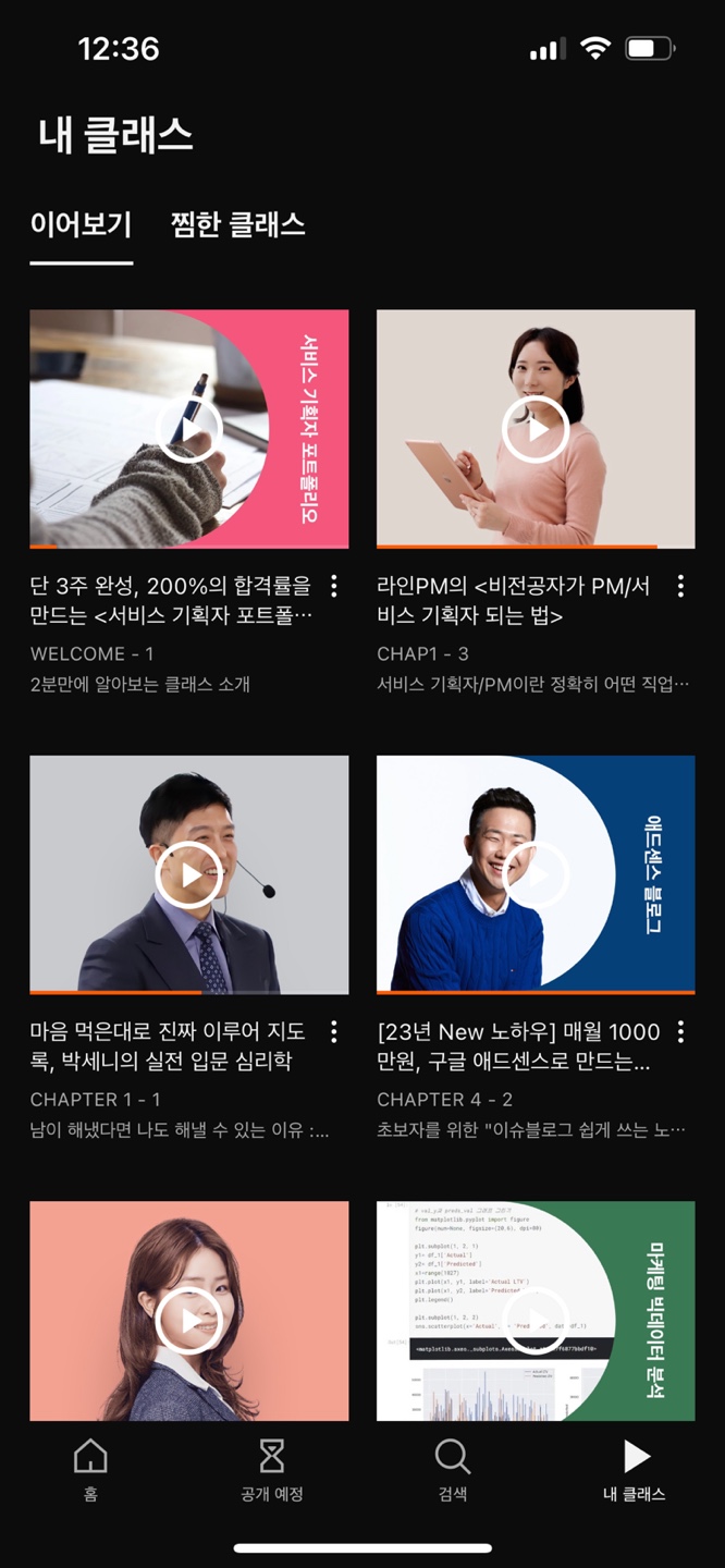 우선 카카오톡을 사용하는 장치에서는 모두 강의 시청이 가능했다. 크롬 브라우저, 아이폰 앱, 아이패드 앱 이 세 가지 기기에서 사용중이다. 대부분 이용하는 교육 플랫폼과 비슷하지만 한 가지 아쉬운점이 있다면 내가 학습하던 강의를 클릭했을 때 이어서 재생되는 것이 아니라 다시 인트로부터 나올때가 있다. 그럴땐 내가 수강했던 부분까지 찾아서 이동해야 했다. 혼자 찾아보던 중에 내 클래스에서 들어가면 이어서 재생이 가능하지만 앱을 처음 키고 내가 듣던 강좌가 노출되어 있을 때 클릭하면 인트로로 나오는 것 같았다. 뭐 내 클래스에서 수강하는 습관을 들여야 하나보다.